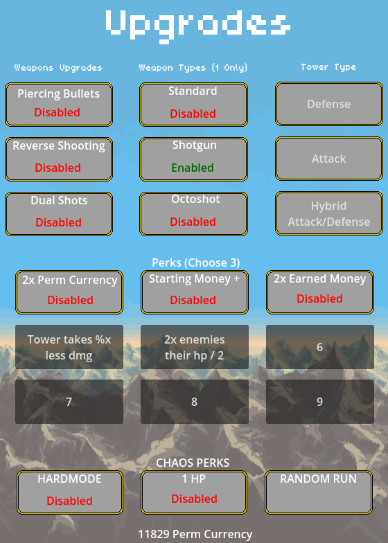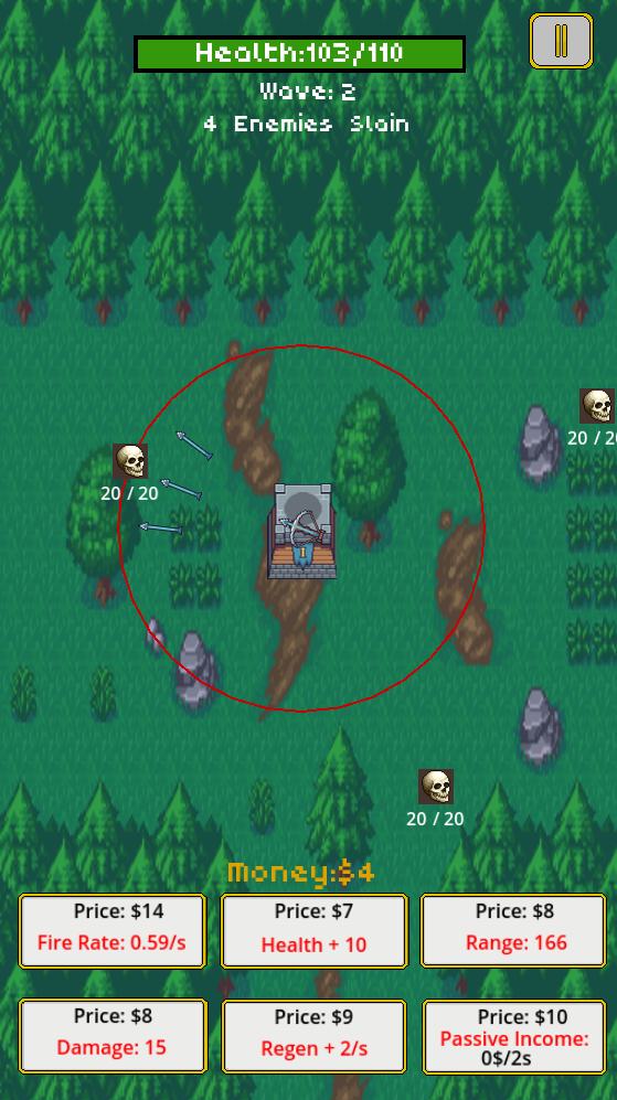 The game I've been working on is an idle tower defense. You are a tower that sits in the center of the screen, defending itself against waves of enemies that spawn all around you attempting to destroy the tower. You have various upgrades, weapons, and perks at your disposal that you can use to help you survive as many waves as possible.